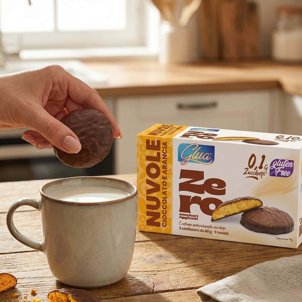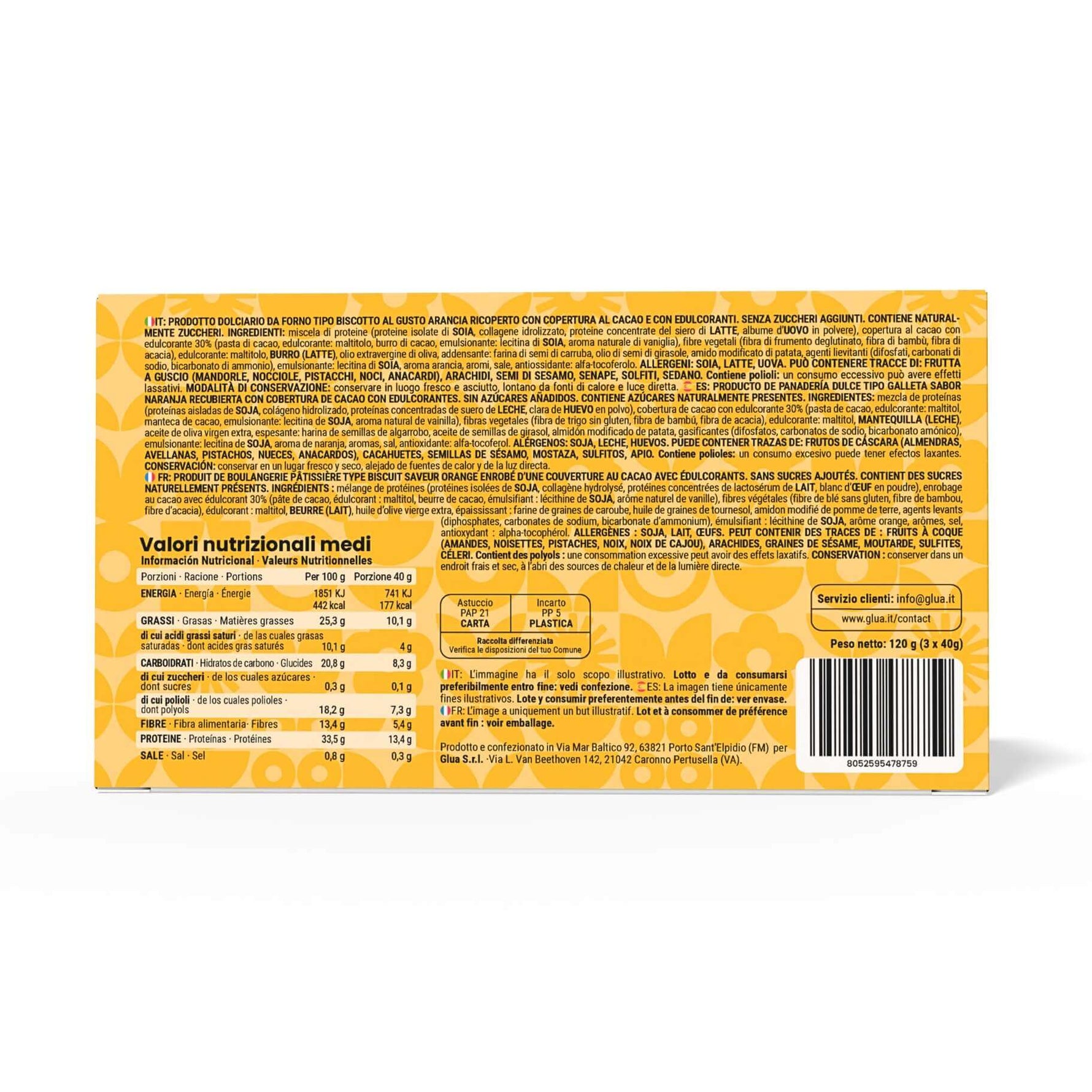 PRODOTTO DOLCIARIO DA FORNO TIPO BISCOTTO AL GUSTO ARANCIA RICOPERTO CON COPERTURA AL CACAO E CON EDULCORANTI.